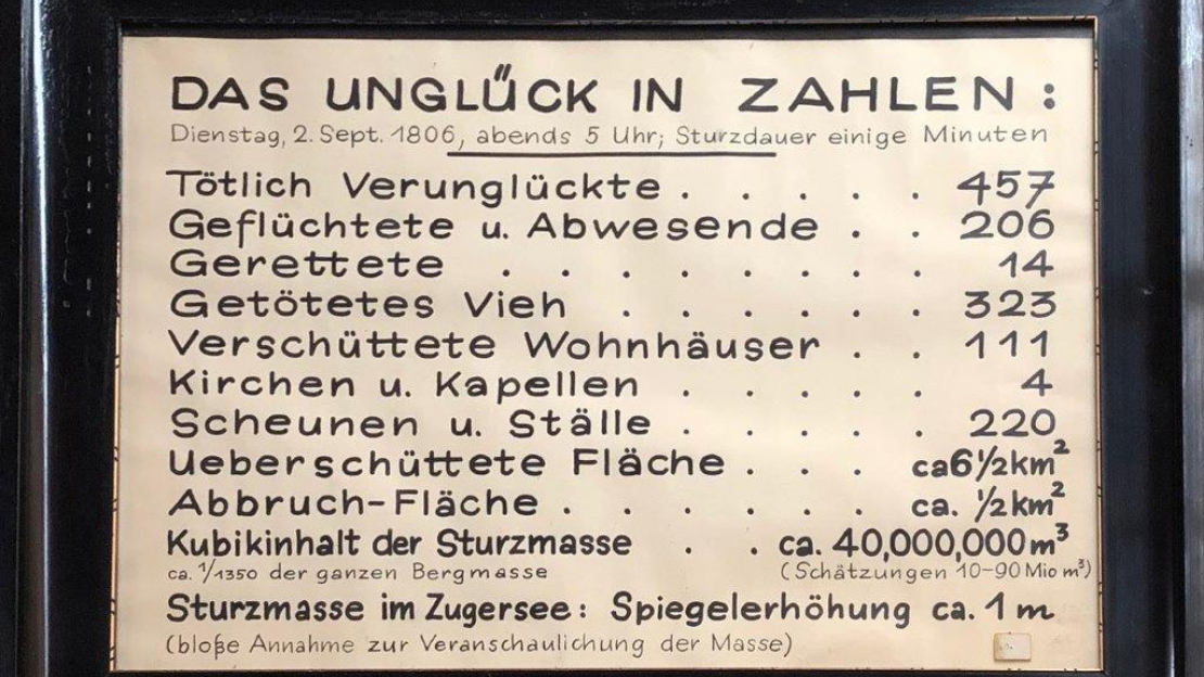 In den Wochen vor dem schicksalhaften Tag regnete es fast ununterbrochen. Um 17.00 Uhr lösten sich die Gesteinsmassen und donnerten ins Tal. Innerhalb weniger Minuten wurden die Siedlungen Goldau, Röthen und Teile von Buosingen unter einer 10 - 50 Meter hohen Schuttschicht begraben. Zudem donnerten die Massen ins Westufer des Lauerzersees. Die dadurch ausgelösten Flutwellen forderten in Lauerz und Seewen mehrere Opfer.